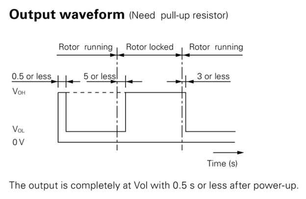 Unlike a DC fan with a pulse tach output (see waveform 1 below) which provides real-time RPM measurements, the locked rotor output only provides an active high logic level when the impeller stops rotating as shown in waveform 2.